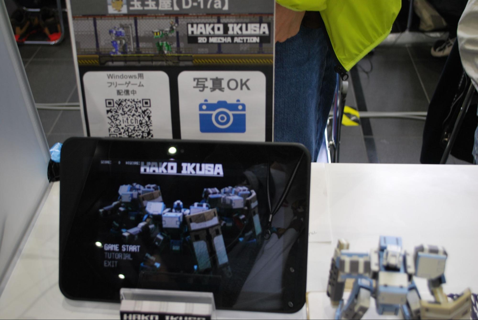 たまって氏が制作した『HAKO IKUSA』は人型戦闘ロボットを操って全6ステージを戦う横スクロール型の2Dアクションゲーム。ブースでは同作に登場するロボットのペーパークラフトが出迎えてくれた。
