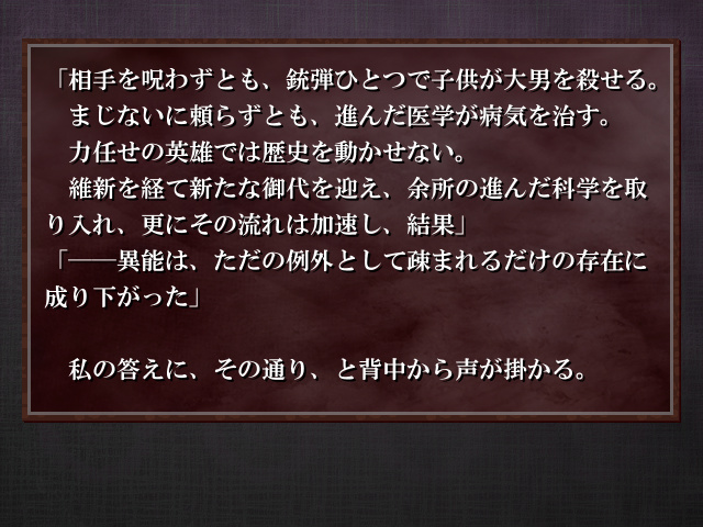 四人の主人公によって描かれる和風伝奇作品。各主人公ごと四つの物語を並行で読み進められるのが特徴で、ある物語の主人公が他の物語に登場するといった形で物語が交差することも。なお、フリー版はBGMの音質向上やスキップ高速化がなされているとのこと。