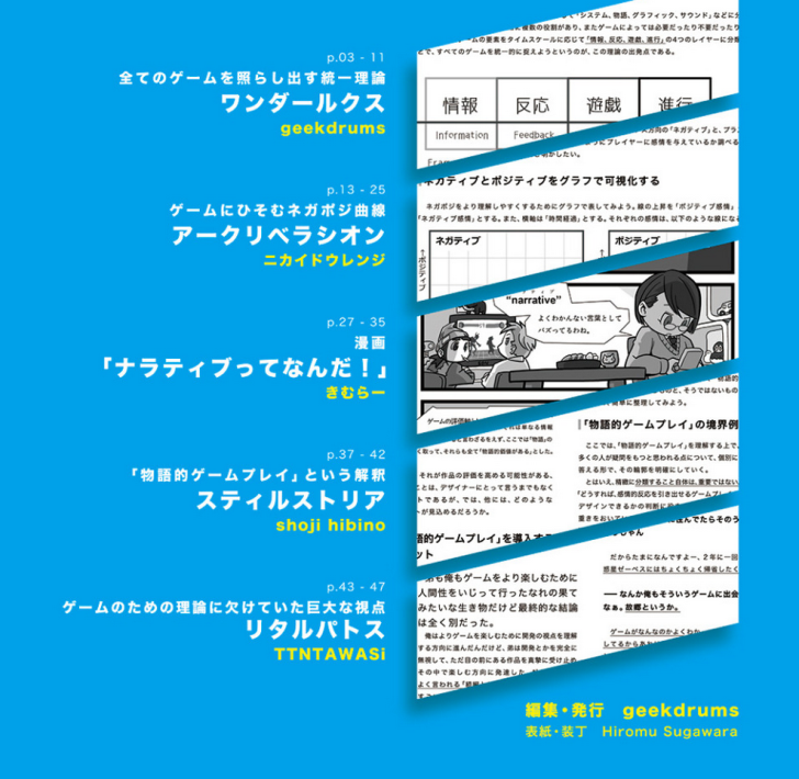 本誌主宰は、「音楽」に着目したゲームの企画・製作を行なってきたgeekdrums氏。ゲームデザインは、プレイヤーから制作者まで幅広い方々に興味がある話題だろう。気になった方はぜひ手にとってみてはいかがだろうか。