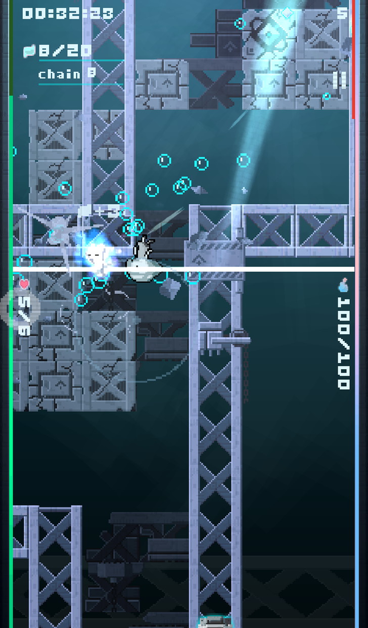 タップしたつもりがフリック入力に化けて炎攻撃がうまく出なかったり、小魚を倒そうとして進みすぎてしまい少女の身体にぶつけてしまうなど、タッチパネル操作ゆえの微調整の効きにくさに悩まされることもあるが、スピーディで激しいアクションを指先ひとつで体感することができる。各アクションを駆使し、押し寄せる敵と罠の群れを素早くくぐり抜けたときの快感はひとしおだ。