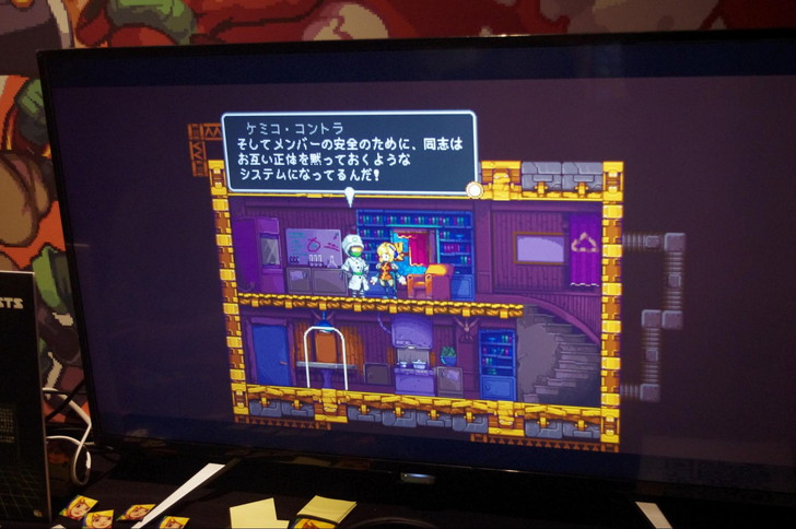 ドイツのインディディベロッパー「Radical Fish Games」が開発を進める早期アクセス作品『CrossCode』の日本語ローカライズが会場でプレイアブル展示された。実は先日中国語ローカライズが実装された際のアップデート告知でBitSummit参加と日本語ローカライズをがんばってるよ!と発表していた。……のだが、下の方に小さく書かれていたものだから全然気づいていなくて、会場について「ああ!日本語がついてる!」と驚かされた。