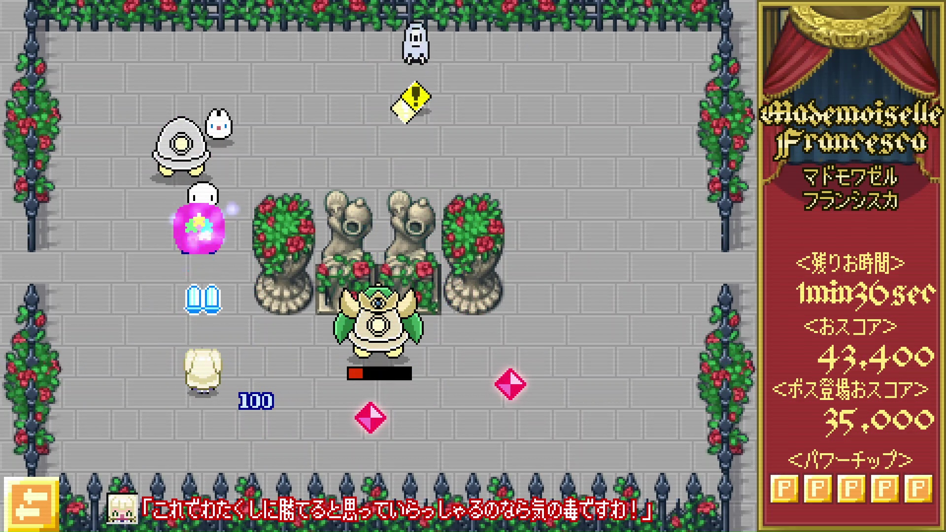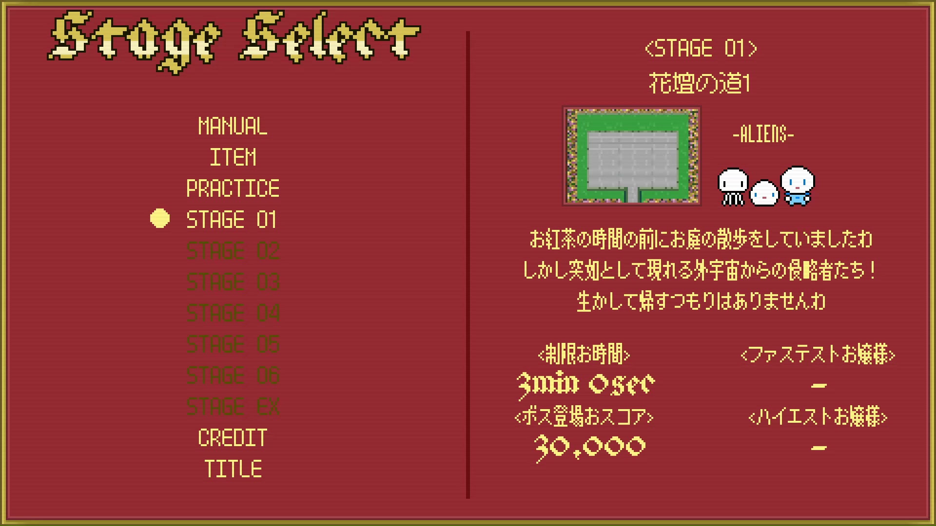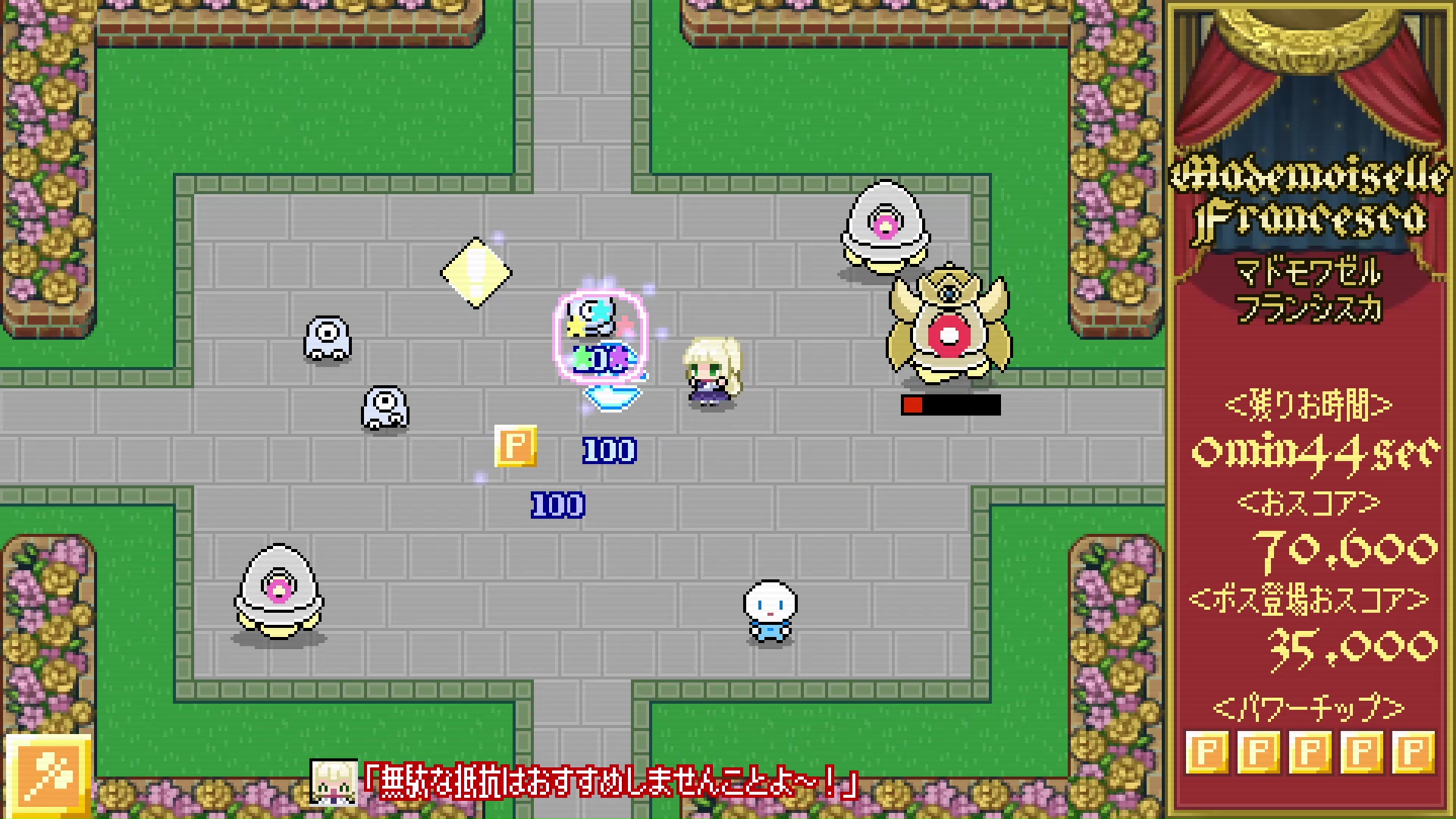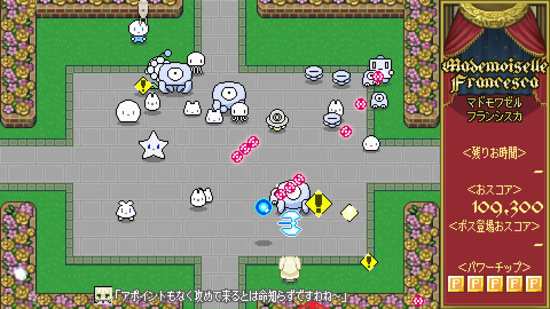 実際はボスが出現しても、雑魚敵の宇宙人たちの出現が止むことはない。そんなのお構いなしに現れてはお嬢様に攻撃を仕掛けてくるのだ。