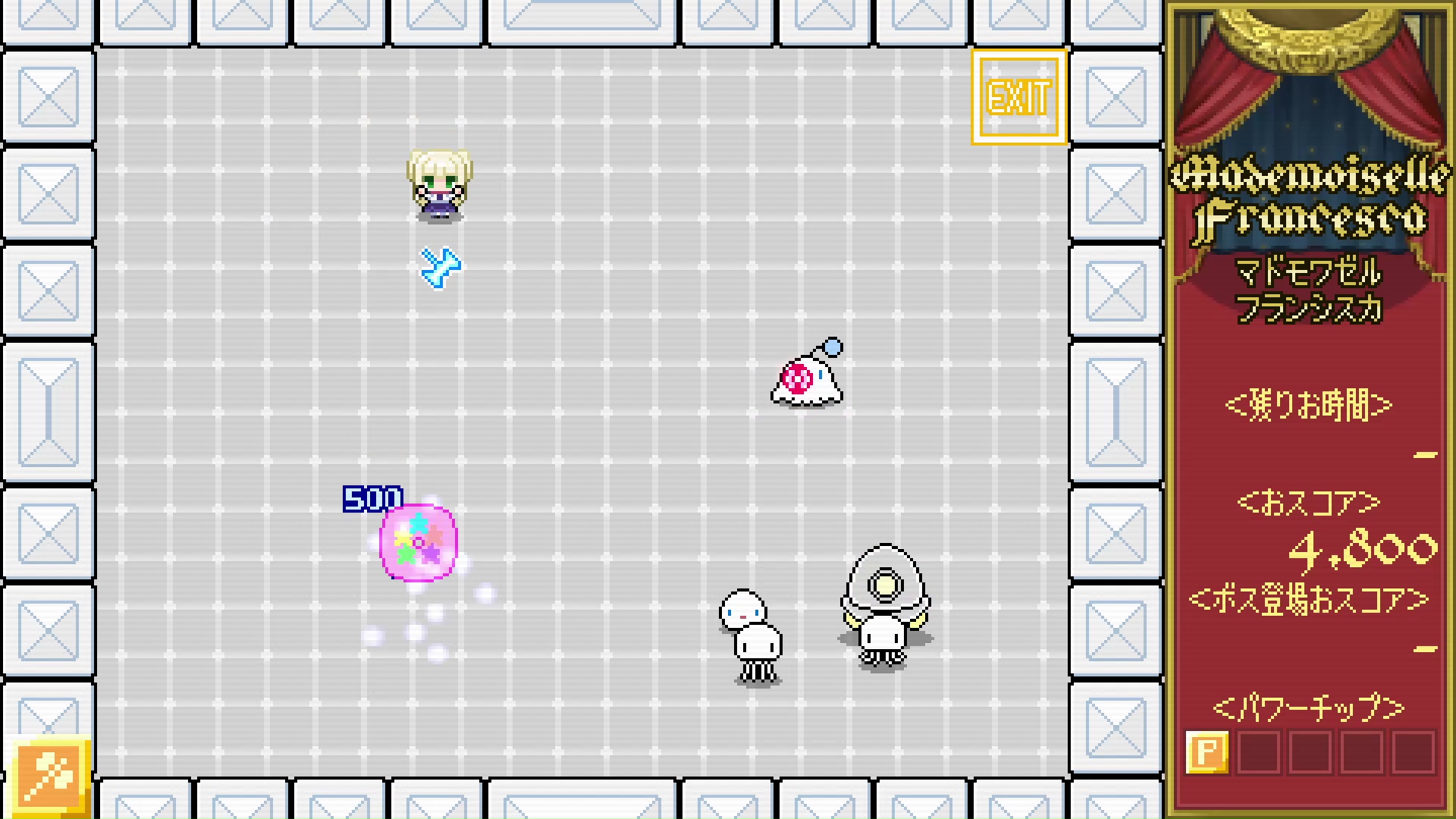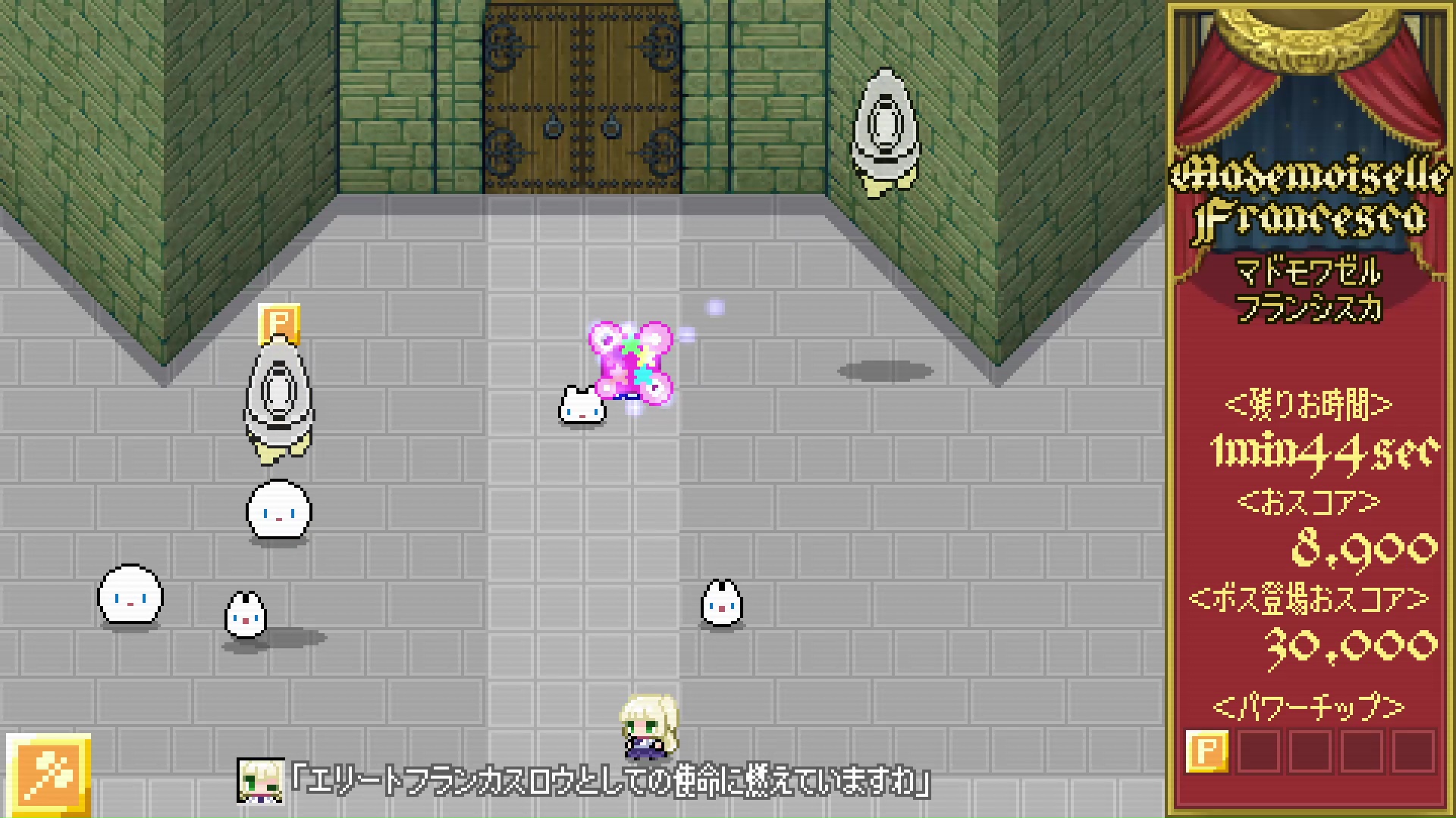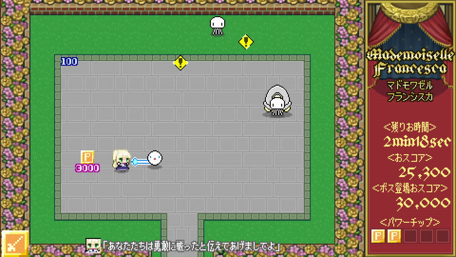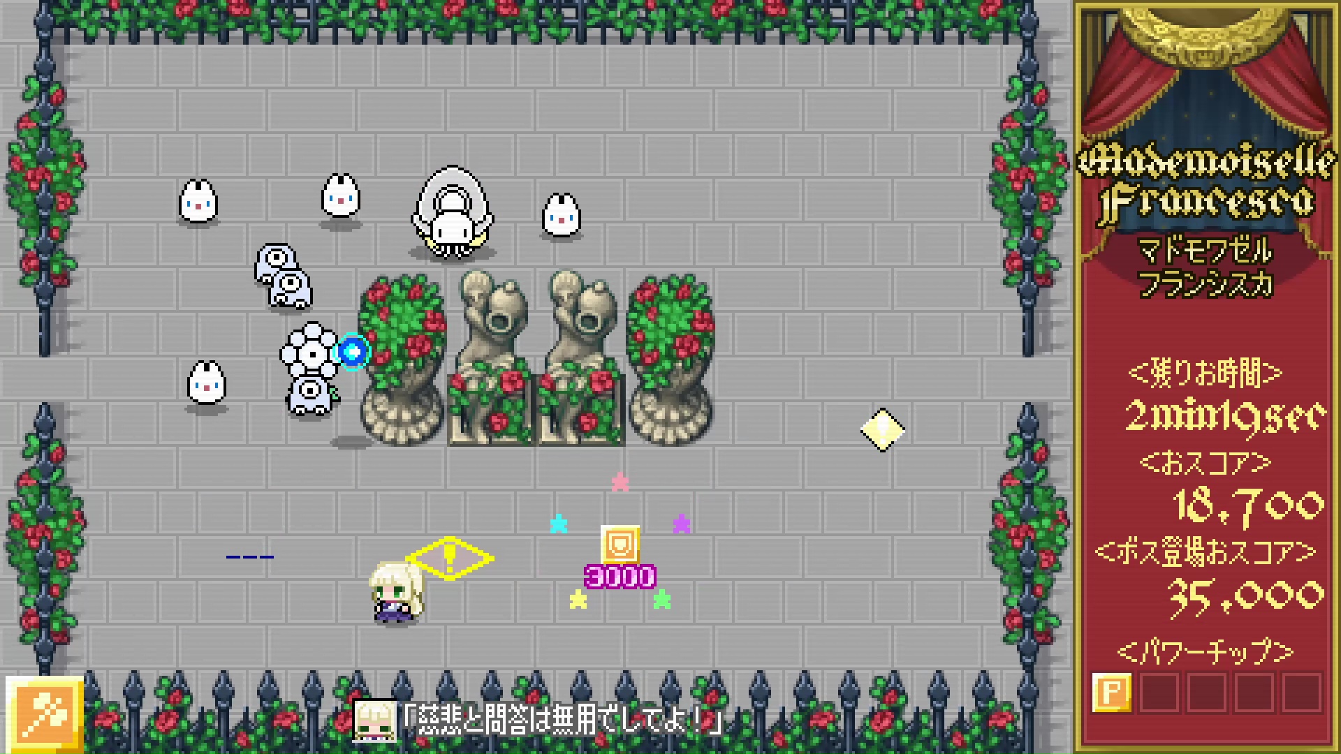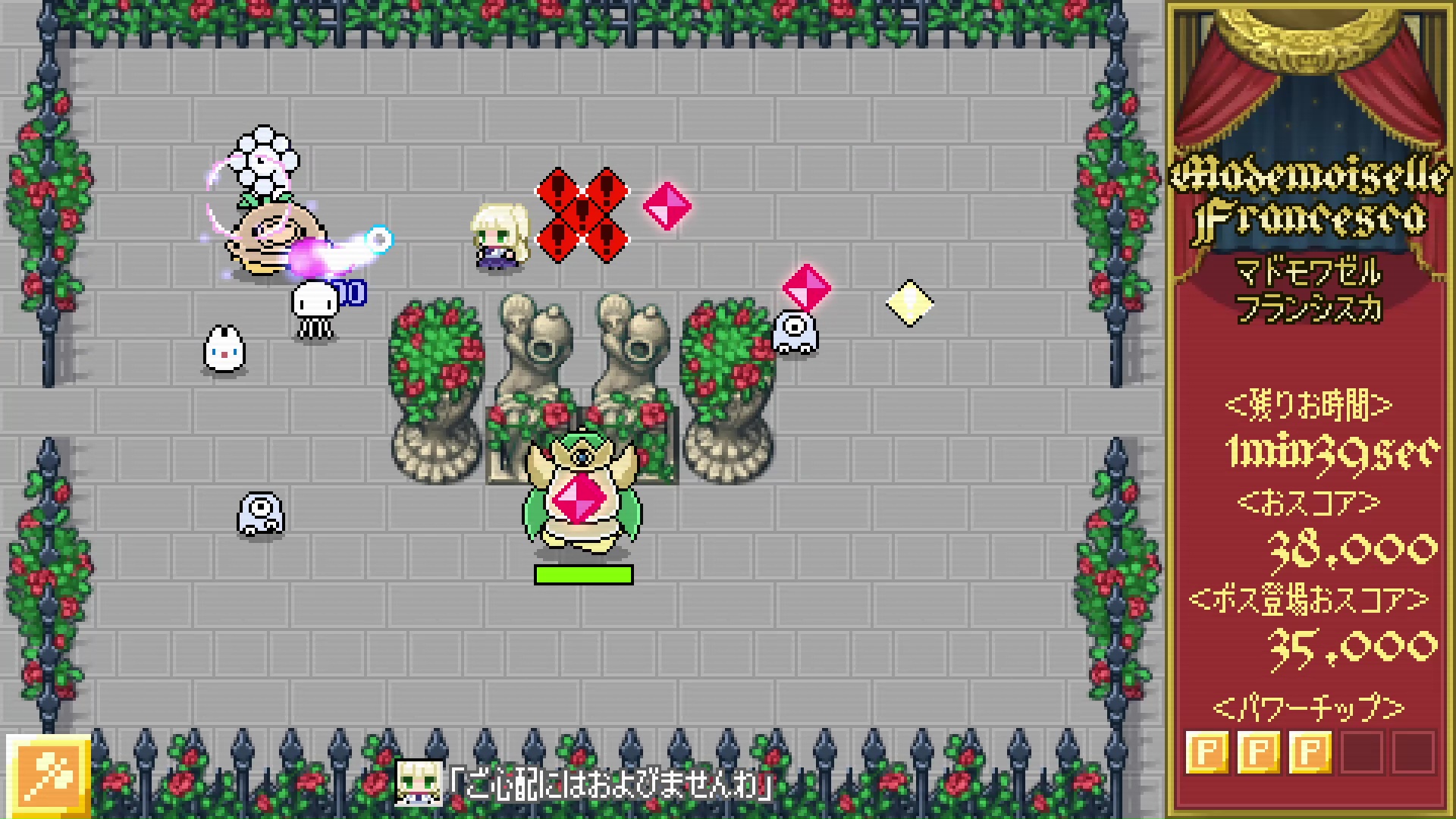 実際はボスが出現しても、雑魚敵の宇宙人たちの出現が止むことはない。そんなのお構いなしに現れてはお嬢様に攻撃を仕掛けてくるのだ。