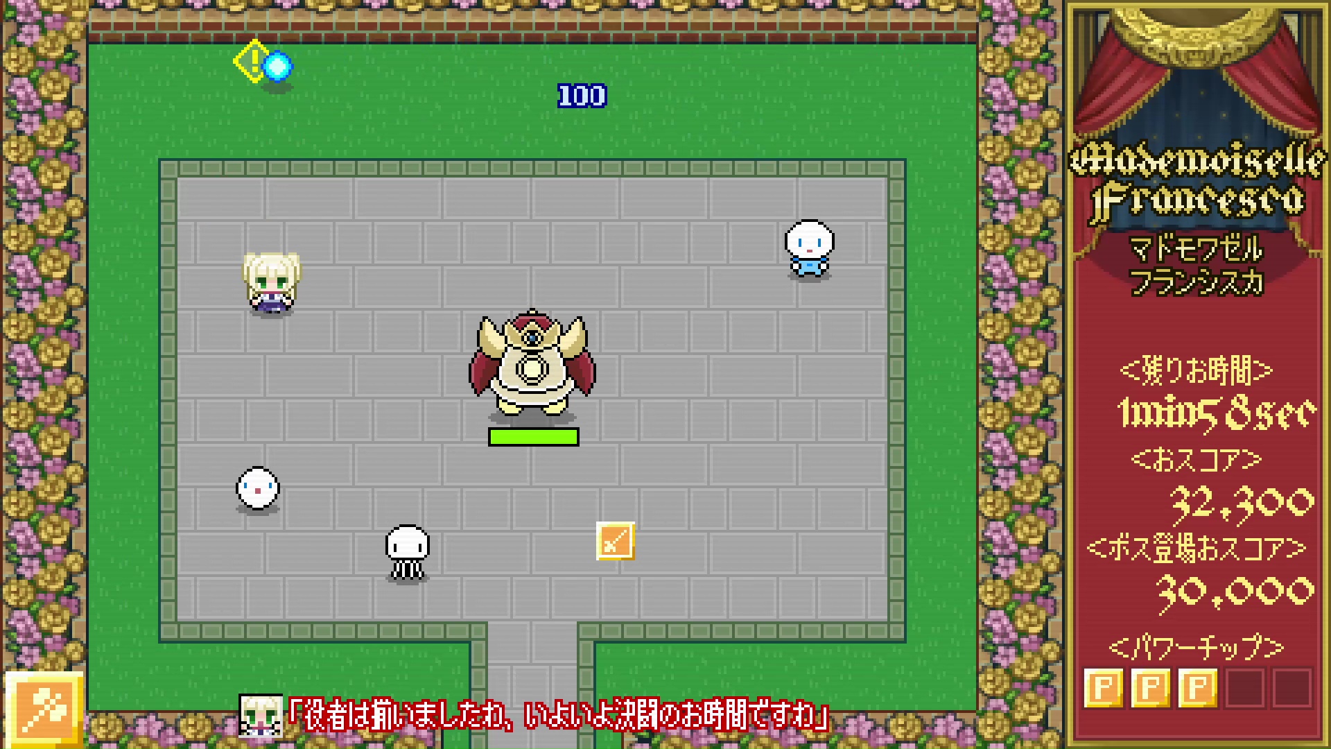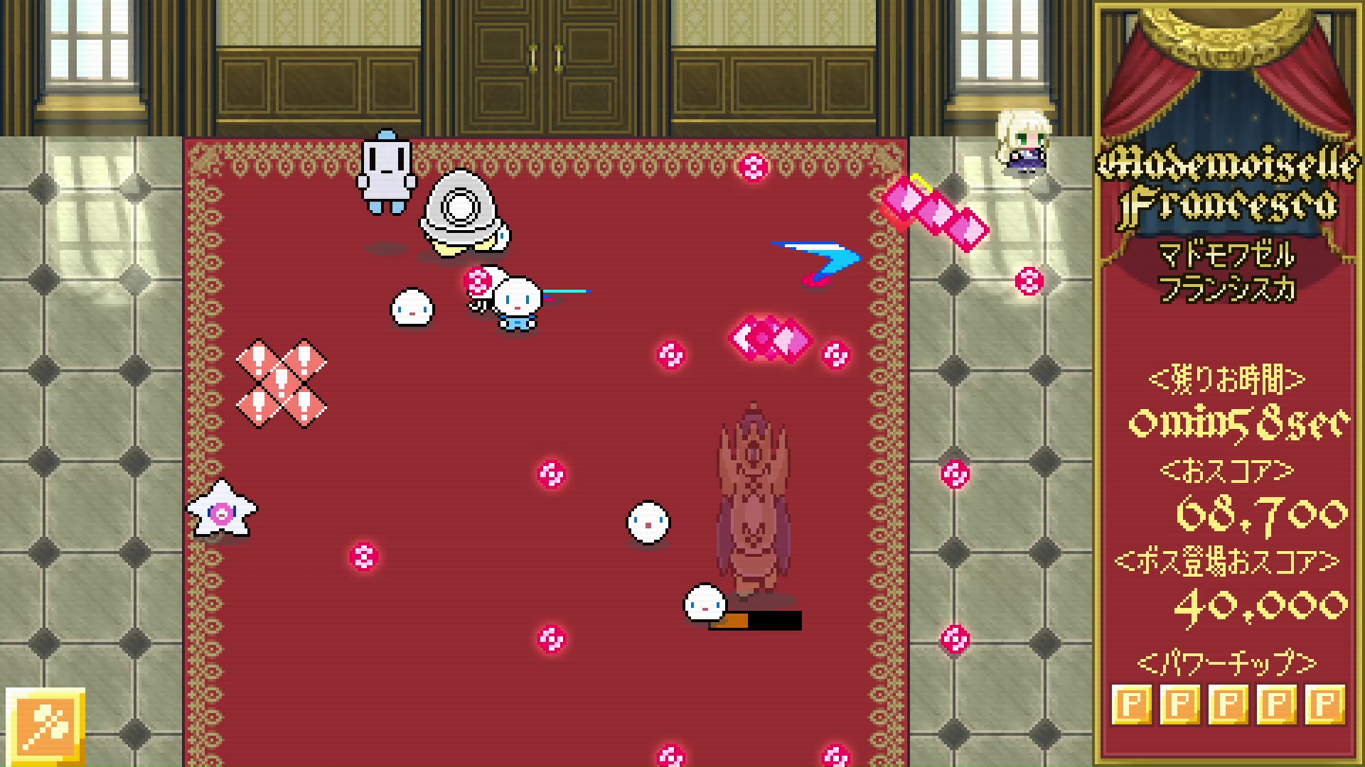 このような気品高き戦闘スタイルで挑む各ステージのクリア条件はボスの撃破である。ボスは「ボス登場おスコア」なるボーダーラインとして設定されたスコアに達すると出現し、戦闘が始まる。