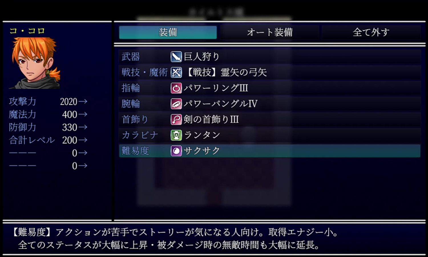 これでさらに痛快なのが、別にこの難易度でプレイする必要がないことだ。実は本作、装備欄から難易度をいつでも変えられるようになっていて、どうせならゴリ押し上等でやりたいなら、そちらで進めてしまうのもアリなのだ。もちろん、その難易度を選ぶことによって特定のストーリー展開が見られなくなるみたいなこともなし。