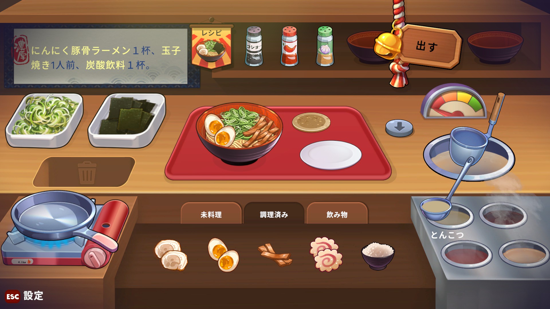 客が求めているラーメンの情報も、調理場画面の左上に常時表示されるため、覚える必要もない。また、制限時間は設けられておらず、レシピの確認も何度も可能だ。なので、個々のペースで自由にラーメンを作れる設計となっている。