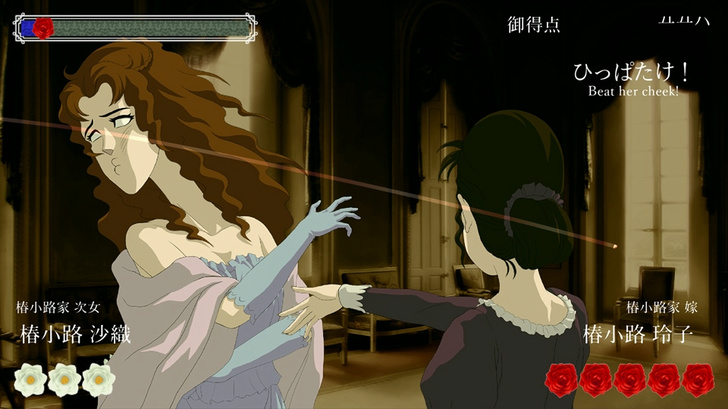 このような物語と共に始まる本作の内容を端的に紹介すると、平手打ち(ビンタ)の応酬である。主人公の玲子となり、高貴ないびりを繰り広げる椿小路家の人々と一対一のビンタバトルに挑む。最終的に相手の体力をゼロにできれば勝利だ。